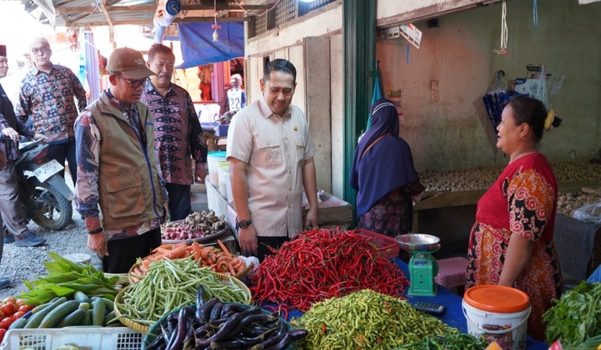 Didampingi Kadis Ketahanan Pangan Ermanto dan Kepala Bulog Hamdani, Bupati menyusuri setiap lorong Pasar Baru untuk memantau harga sembako, ayam dan daging.