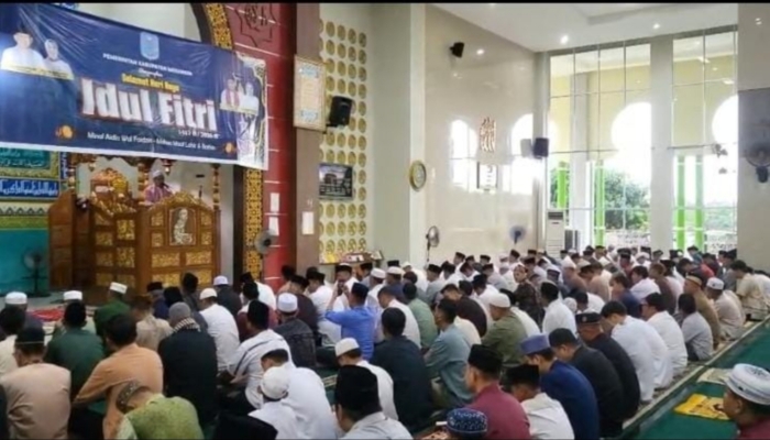 BANGKO – Jajaran pimpinan Pemerintah Kabupaten Merangin melaksanakan ibadah salat Idul Fitri 1447 H di Masjid Baitul Makmur, Bangko, pada Sabtu (21/03/2026).