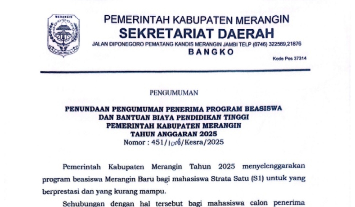 Penundaan Pengumuman Penerima Program Beasiswa Merangin Baru 2025